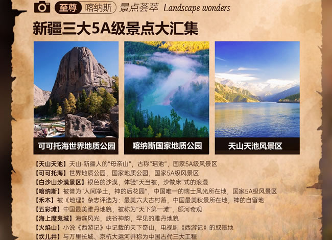 【白沙山沙漠】(贈(zèng)送,游覽約1小時(shí))白沙山意為銀色的沙漠,只有460米高,高度上在帕米爾高原上確實(shí)比較弱,但白沙山長(zhǎng)度卻綿延1200米,每當(dāng)有勁風(fēng)吹來,白沙山都會(huì)發(fā)出響聲,故而又被稱作“響沙山”。與白沙山緊鄰的兩個(gè)湖泊,水草豐美,水鳥聚集,為這座白色的山峰平添了幾分清新活力。從遠(yuǎn)處望去,在遠(yuǎn)方的青山和近處綠草的映襯下,白沙山有的像埃及的金字塔,有的像棱角分明的歐式建筑,還有的像一條銀色巨龍靜臥在碧波蕩漾的大海上。銀色的細(xì)沙潔白柔和,像嬰兒的肌膚,令人心動(dòng),不忍下足。獨(dú)家贈(zèng)送【全地形沖浪車激情體驗(yàn)】(專業(yè)車手駕駛 贈(zèng)送項(xiàng)目自愿放棄,不做任何退費(fèi))隨著車速的增加,沖浪車猶如一艘勇敢的船只,在沙丘之間往返穿梭,留下一道道深深淺淺的車轍,沙丘在車輪下迅速閃過,仿佛一朵朵巨大的浪花在沙漠中翻滾,翻越陡峭的沙丘,穿越沙漠中的障礙 ,給人帶來前所未有的刺激和樂趣,以及征服自然的成就感;【喀納斯景區(qū)】(含門票+區(qū)間車,游覽時(shí)間約2小時(shí))國(guó)家AAAAA級(jí)旅游景區(qū),位于新疆維吾爾自治區(qū)阿勒泰地區(qū)布爾津縣北部,有駝?lì)i灣、變色湖、臥龍灣、月亮灣、神仙灣等主要景點(diǎn);電影[天地英雄]、劉若英-[分開旅行][原來你也在這里]的取景地;【圖瓦人探秘】(贈(zèng)送,游覽約1小時(shí))進(jìn)入圖瓦人家木屋,圍坐在一起,品嘗香醇的奶酒、奶酪、民族點(diǎn)心,聆聽圖瓦人特有的民族樂器-蘇爾演奏,婉轉(zhuǎn)的曲調(diào),悠遠(yuǎn)悠長(zhǎng),恍若隔世,伴隨原汁原味的音樂欣賞蒙古族圖瓦人的磅礴舞姿,豪放有力,不禁讓人潸然淚下。